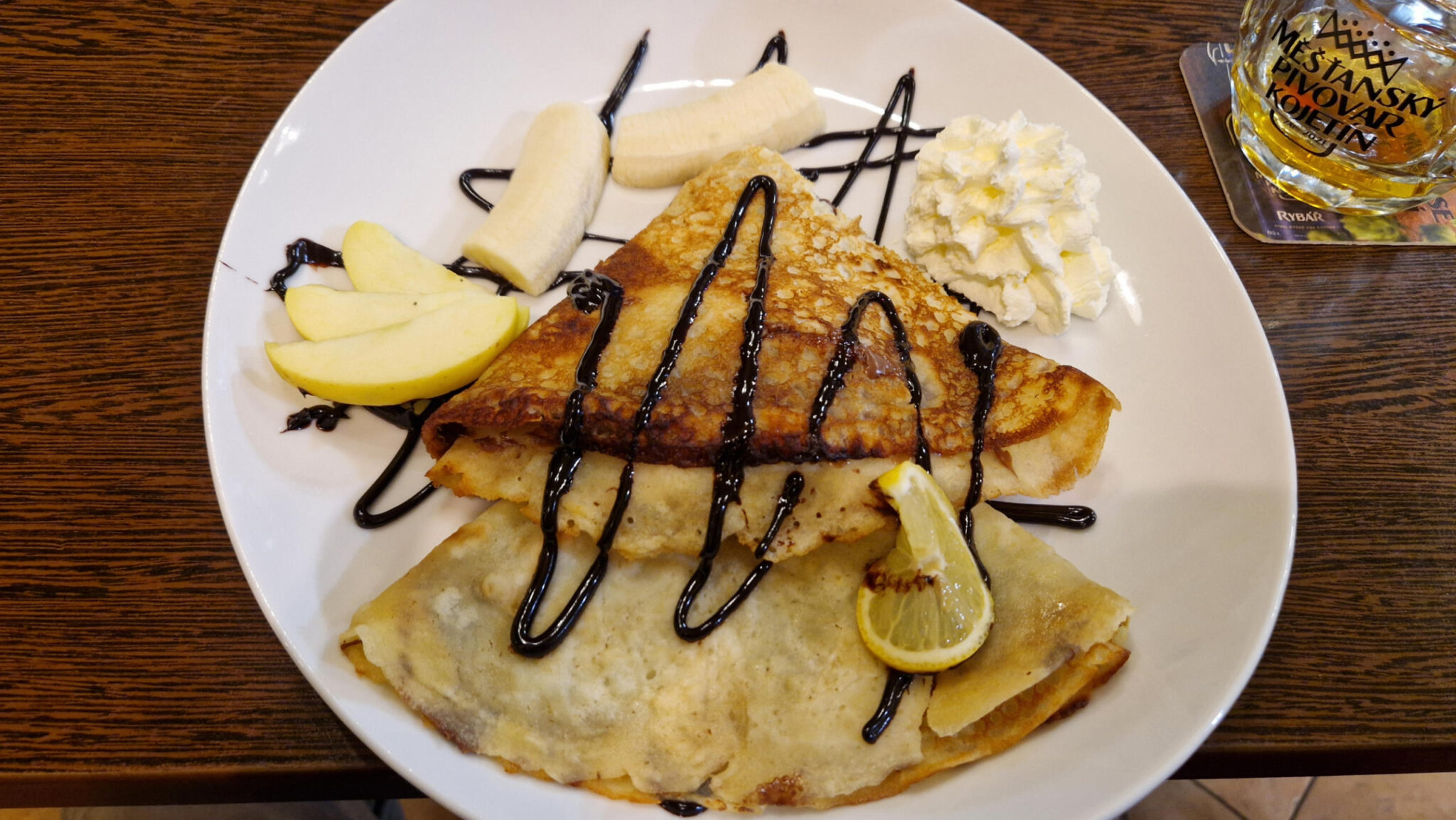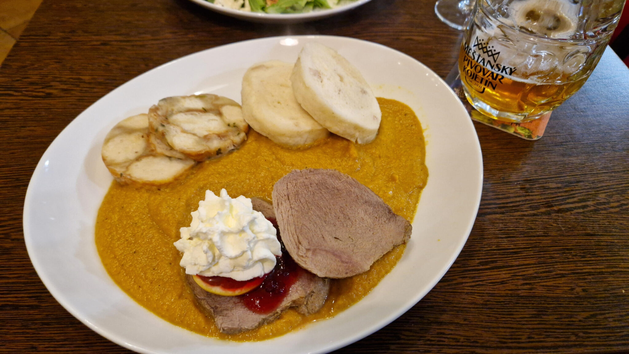 Im Restaurant vom Hotel gegessen. Rehbraten (315czk=12,9€), Bier(55czk=2,3€), Palatschinken(135czk=5,6€). Dann noch eine Runde durch die Stadt gelaufen.