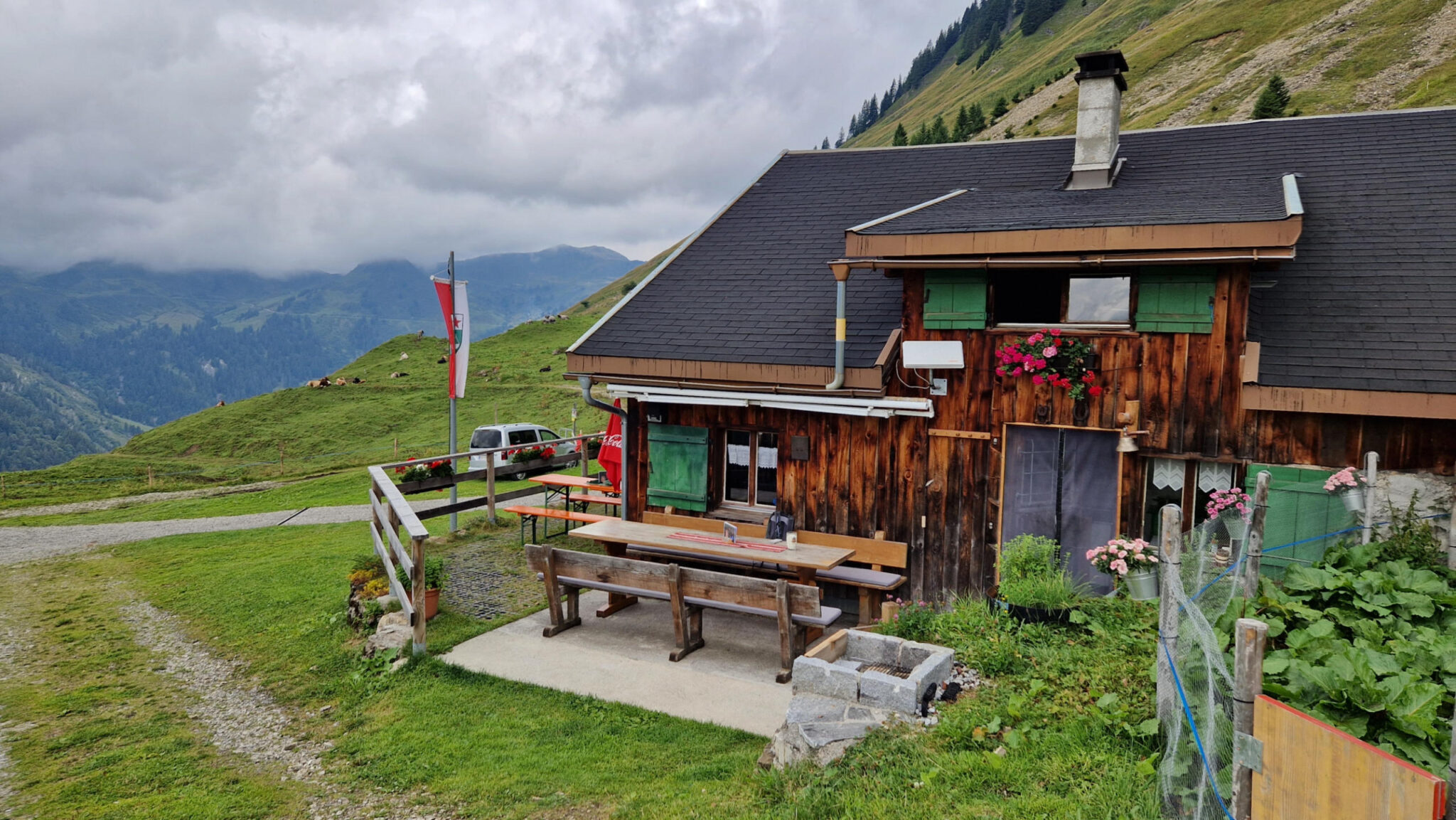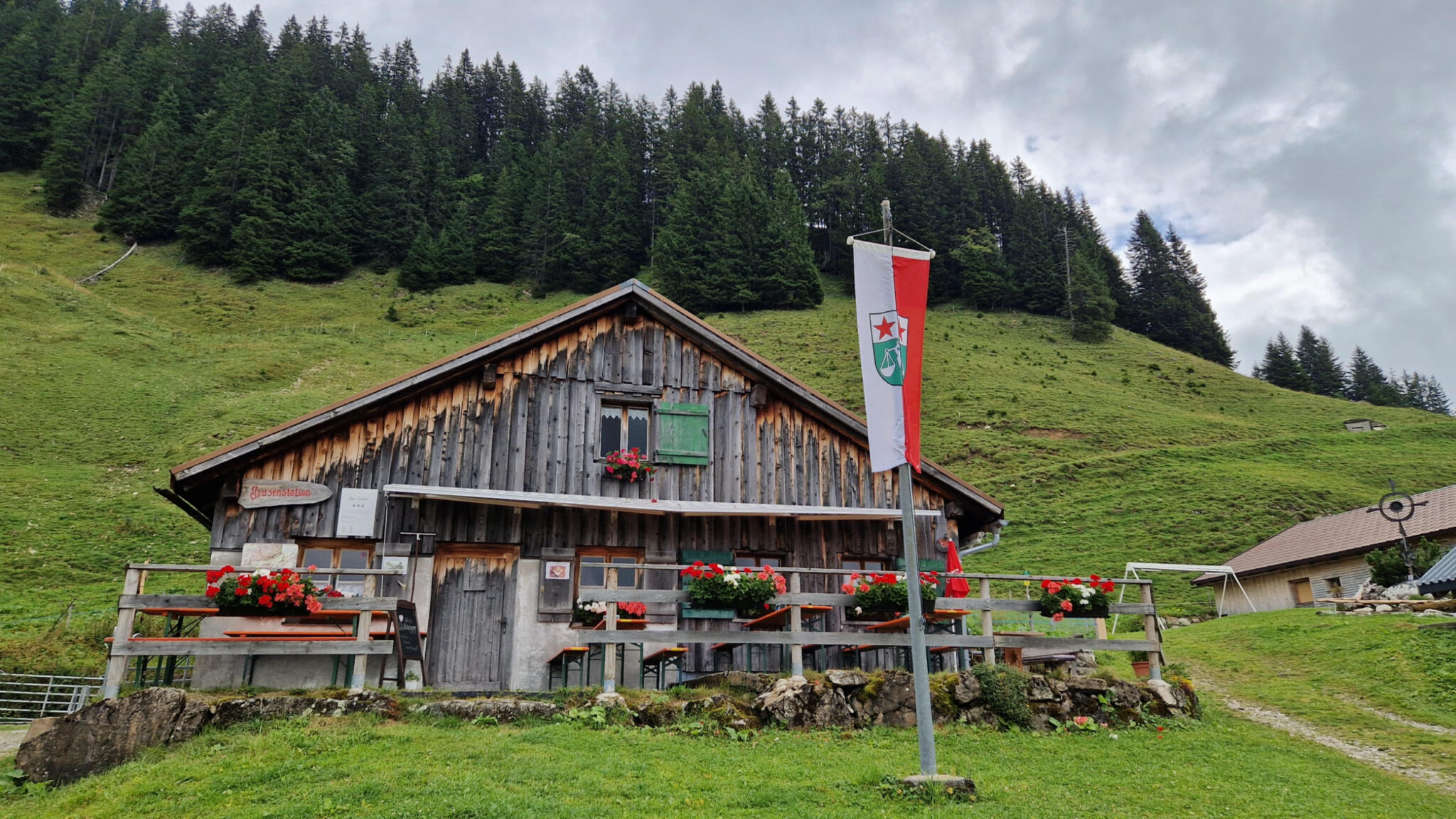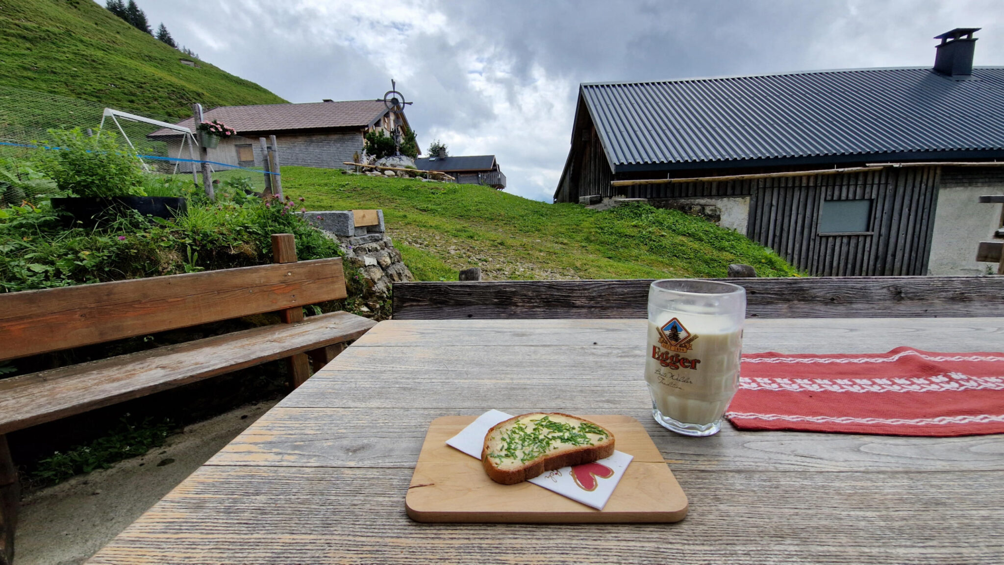 Bei der Türtschalpe ein Butterbrot (3€) mit Schnittauch (2,50€) und frische Milch. Vor 2 Wochen hatte ich diesen Alm in der Weite mitten im Nichts gesehen und diese Wanderung so überlegt.