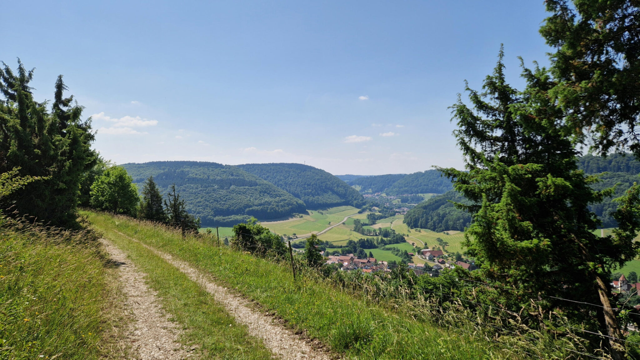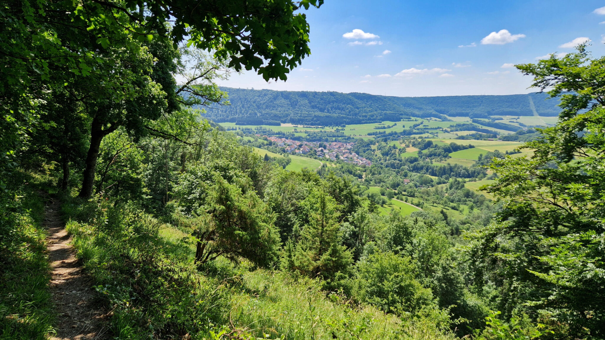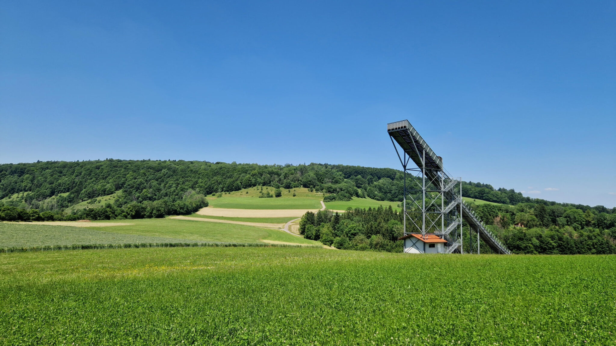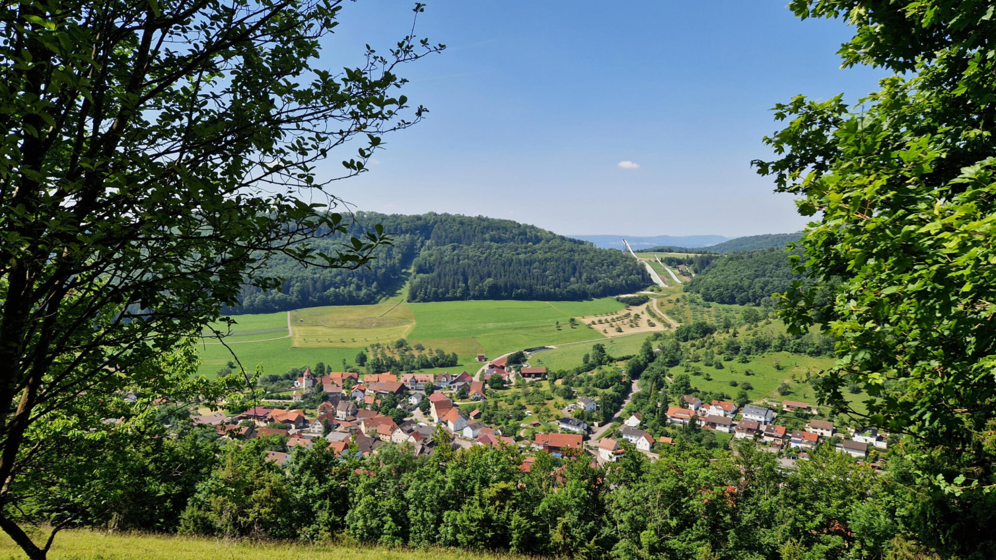 Die schmale pfade und Weitblicke ins Tal geben ein guten Alpengefühl. Auch eine Skisprungschanze in Degenfeld.