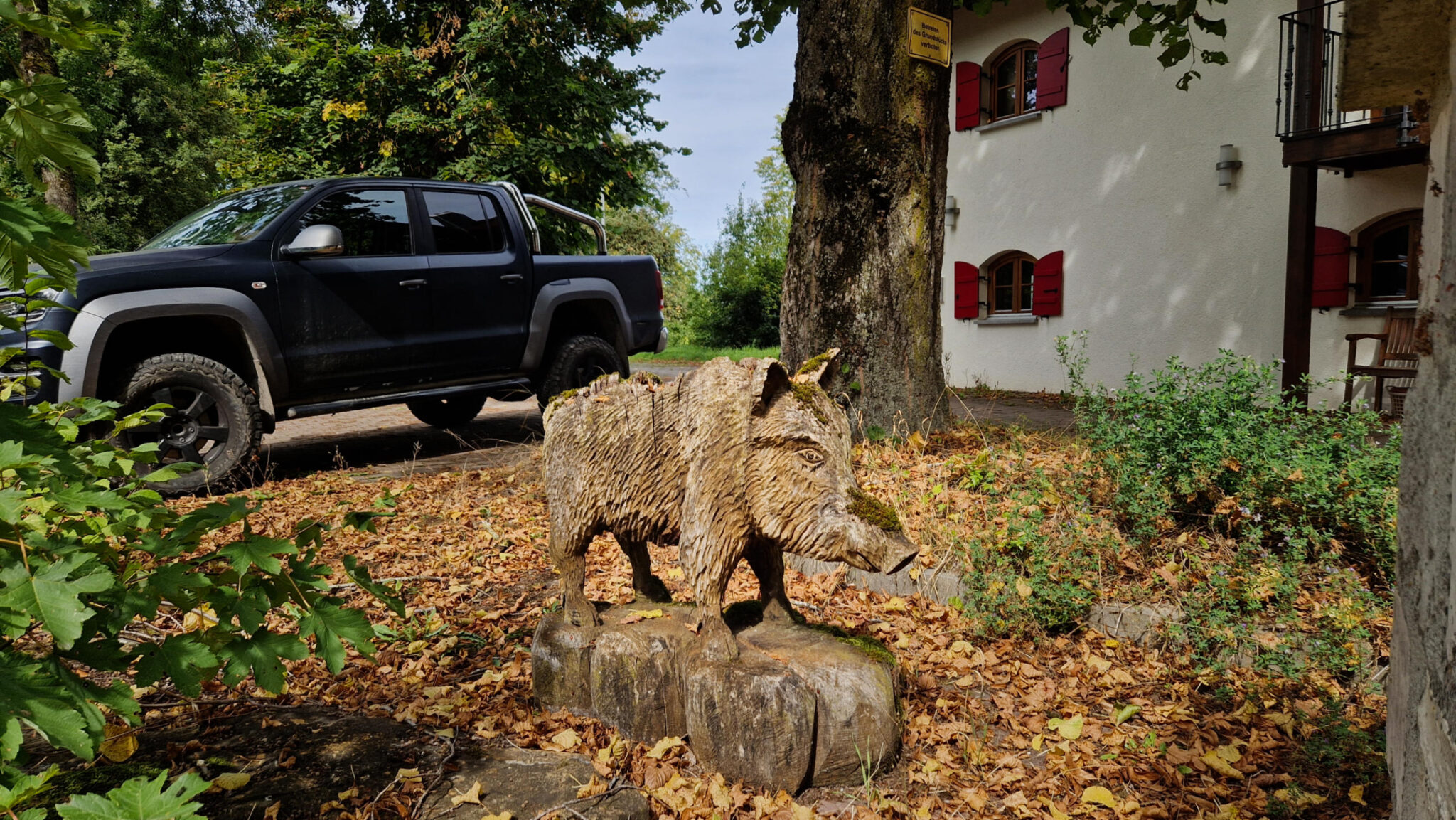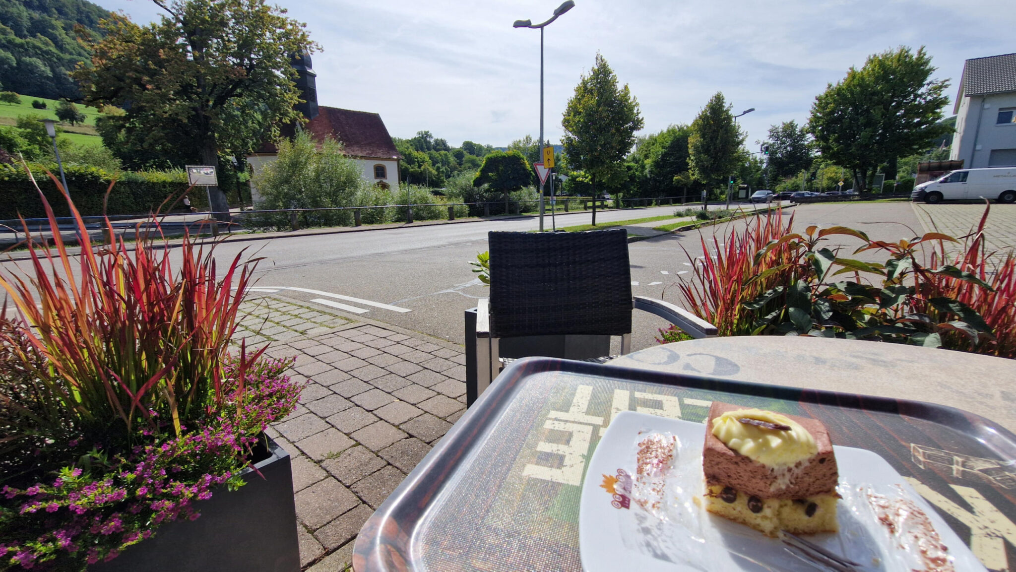Vor ein paar Wochen hatte ich so einen guten Eierlikör Kuchen bei Landbäckerei Geiger in Lauterstein. Den hatten die aber heute nicht. Dafür ein Schokokuchen mit Aussicht auf der letzte Kapelle vom Kapellenweg.
